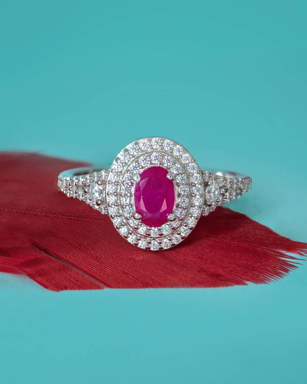 Exquisite and radiant, this ring is masterfully crafted in 925 sterling silver and designed to showcase a captivating oval-shaped Burmese Ruby (6mm x 4mm, 0.40 cts). Renowned for its vivid crimson hue, the ruby is meticulously framed by two dazzling halos of Cubic Zirconia, further enhancing its brilliance and allure. The band itself is delicately studded with Cubic Zirconia, completing the design with a glamorous sparkle from every angle.